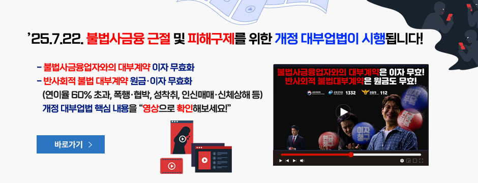 ➀ ’25.7.22일 불법사금융 근절 및 피해구제를 위한 개정 대부업법이 시행됩니다. 새 법에 따르면, 연이자율 60% 초과 초고금리, 성착취, 인신매매·신체상해, 폭행·협박 등 반사회적 대부계약은 원금·이자를 모두 갚지 않아도 됩니다. 반사회적 대부계약이 아니더라도, 불법사금융업자와의 대부계약은 이자를 갚지 않아도 됩니다.