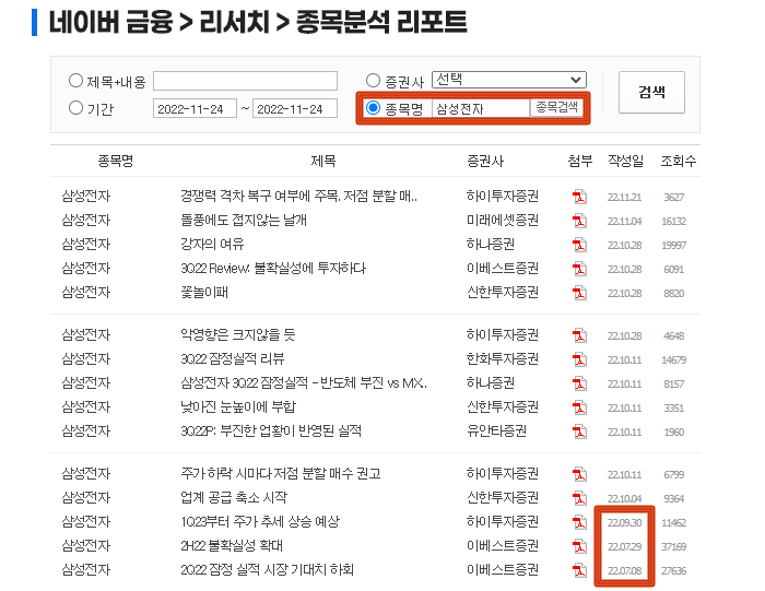 검색 결과를 확인해보니 삼성전자는 코스피 시가총액 1위인데 2022년 7월은 잠정 실적 및 확정 실적 발표도 있었는데 올라온 ‘리포트 개수가 너무 없는 것 아닌가’하는 생각이 드시지 않나요? 8, 9월도 마찬가지이고요.