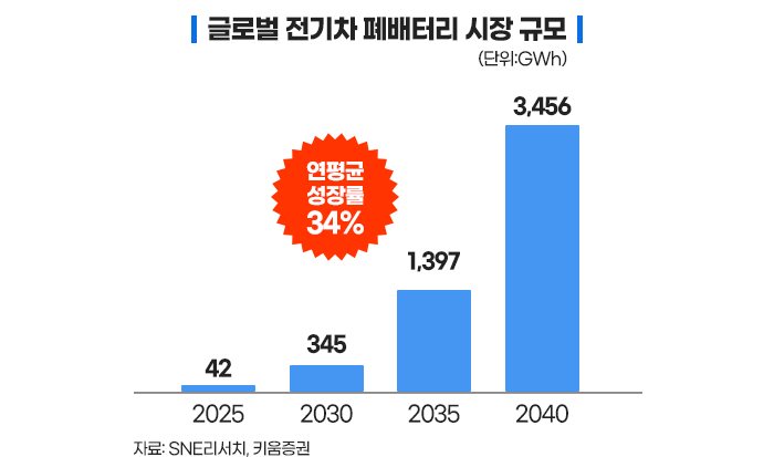 용량 기준으로 폐배터리 시장은 2025년 42GWh에서 2030년 345GWh, 2040년 3,455GWh 규모로 성장할 것으로 예측되고 있는데, 연평균 성장률은 34%에 달합니다.
