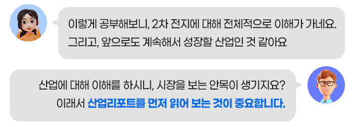 셀 업체, 소재 업체, 장비 업체 등 2차 전지 관련된 기업들은 정말 많습니다. 그래서 2차 전지에 관심을 가지려는 분들은 종목 리포트도 중요하지만, 2차 전지 산업리포트를 먼저 보고 큰 흐름을 이해하면 관련 기업들을 분석하는 데 도움이 될 것입니다.