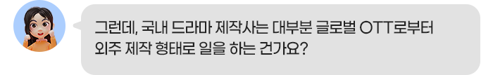 그러다가 2010년대에 들어 글로벌 OTT의 외주 제작이 새로운 수익모델로 등장하였고, ‘오징어 게임’, ‘킹덤’ 등이 외주 제작 형태였는데, 드라마는 글로벌 흥행에 성공하였지만, IP는 OTT가 가져갔기 때문에 아쉽지만 제작사는 큰 수익을 내기 힘들었습니다.