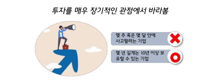 또한 투자를 매우 장기적인 관점에서 바라봤습니다. 단순히 몇 주, 혹은 몇 달 안에 사고 팔려는 기업을 찾지 않고, 몇 년, 길게는 10년 이상까지 보유할 수 있는 기업을 찾았습니다.