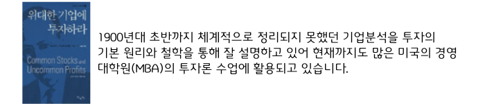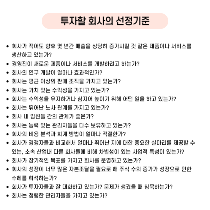 그의 저서 '위대한 기업에 투자하라'에서 15가지의 투자할 회사의 선정 기준을 다음과 같이 소개하고 있습니다.