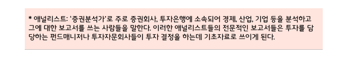 증권시장에서 투자자들을 위해 이러한 일을 전문적으로 하는 사람을 애널리스트라고 하며, 증권회사에 소속되어 경제, 산업, 기업 등에 대한 분석 보고서를 작성하는 역할을 합니다. 주요 연기금, 투자 기관들은 이러한 보고서를 바탕으로 자금의 투자계획을 세우게 됩니다.