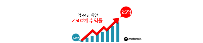 가장 대표적인 예가 통신 기업인 모토롤라를 발굴한 것으로 약 44년 동안 2,500배에 가까운 경이적인 수익률을 기록하게 됩니다. 100만원만큼의 주식을 가지고 있었다면, 25억원이 된 셈이니 놀랍지 않을 수 없습니다.