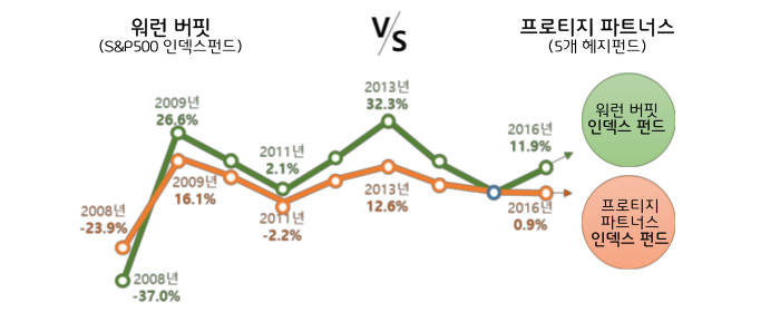 실제로 미국에서 S&P 500과 같은 시장 평균을 이기기 위해 만들어진 펀드 중 85%는 시장 평균을 이기지 못하는 것으로 나타났으며, 2007년 말 시작된 세기의 대결, 워런 버핏(S&P 500 인덱스펀드 투자) 대 프로티지 파트너스(5개 헤지펀드 투자)의 10년 수익률 대결에서 워런 버핏이 압도적인 차이로 승리했다는 것은 잘 알려진 사실입니다.