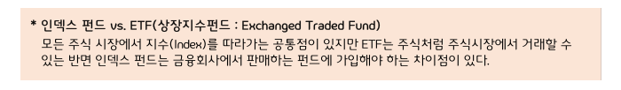 이와 같이 인덱스 펀드는 시장 전체에 투자되므로 특정 기업의 주가에 문제가 생기더라도 그 손실이 분산될 수 있으며, 잘못된 종목 투자로 인한 위험을 줄일 수 있습니다. 다만, 이러한 인덱스 펀드(ETF)도 지수와 실제 펀드의 성과가 얼마나 일치하는지(추적오차)를 확인해야 하고(추적오차가 낮을수록 우량한 ETF), 해당 펀드마다 구성하고 있는 종목이나 수수료 부과 방식이 차이가 있어, 이에 대한 정보를 잘 확인하고 투자해야 합니다.