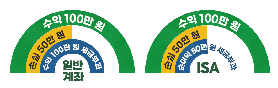 일반 계좌는 100만 원 수익에 대해 세금을 부과해요. 손실은 인정해 주지 않아요. 하지만 ISA 계좌는 100만 원 - 50만 원 = 50만 원 순이익에만 세금을 계산해요. 실제로 번 돈에만 세금을 부과하는 거죠.