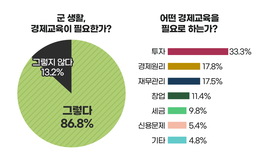 많은 장병이 이 방법들을 배우고 싶어 하죠. 투자 교육을 원합니다. 실제로 육군 사병 대상 설문조사에서 응답자의 86.8%가 '군 생활 중 경제교육이 필요하다'고 답했어요. 어떤 경제교육이 필요한지 묻는 질문에는 1순위가 '투자'였고요.(한국개발연구원, 2023년 4월)