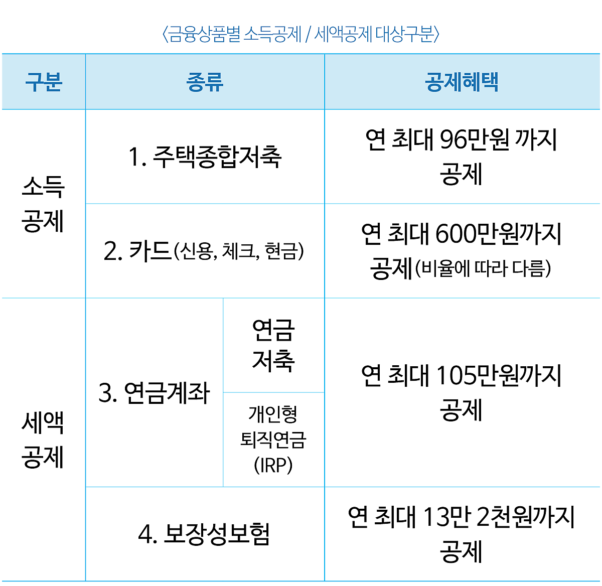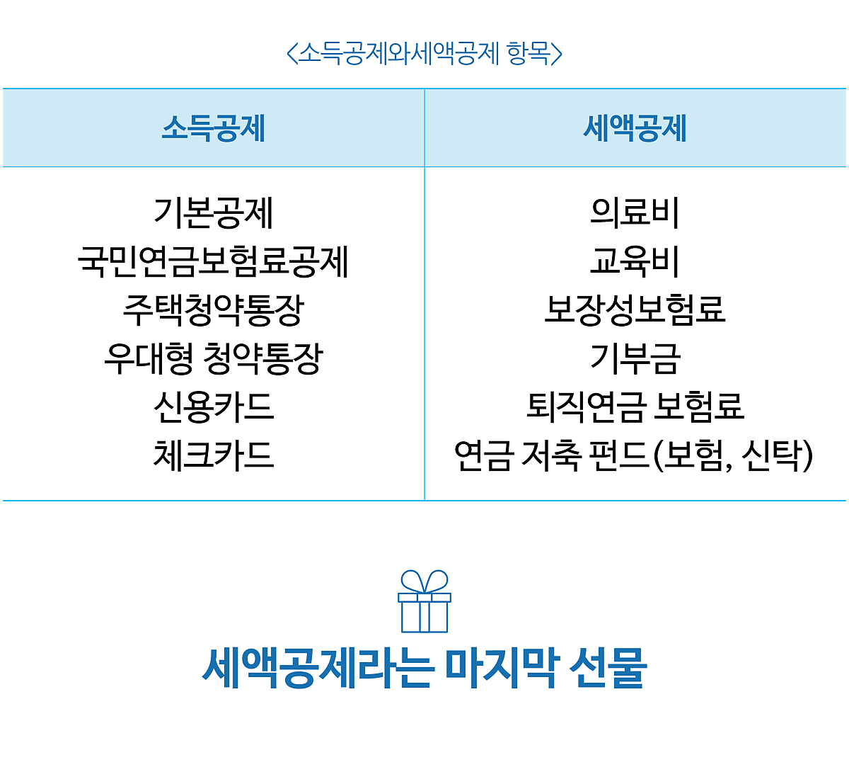 급여를 받으면 가장 먼저 비과세소득을 차감한다. 그러면 소득이 산출되고, 그 소득에서 두 번째로 소득공제라는 항목을 차감한다. 그리고 나면 소득 금액이 된다. 소득 금액에서 소득공제 항목을 차감하는 데 소득공제의 종류에는 다음과 같다. 가족이 있으면 기본공제, 국민연금보험료만큼 차감하는 국민연금보험료공제, 주택 마련을 위해 저축하는 만큼 차감하는 주택청약통장, 최근에 도입된 청년 우대형 청약통장, 그리고 신용카드와 체크카드 등이 해당한다.