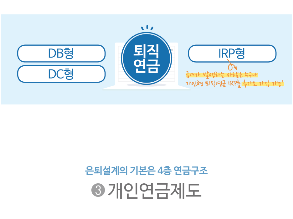 퇴직연금은 근로자퇴직급여보장법에 따라서 퇴직 전 3개월 평균 월 소득에 근무연수를 곱한 금액을 퇴직금으로 주어야 하는데 이를 회사 밖의 금융기관에 맡긴다. 퇴직연금의 종류에는 회사가 운영해서 퇴직연금을 지급하는 DB형, 직원 스스로 투자를 해서 운영하는 DC형, 55세 이전에 퇴직한 사람이 퇴직연금 수령하는 55세가 될 때까지 거치해 두는 IRP형이 있다. 최근에는 직장인 가입자나 일반 사업자, 공무원 등 급여가 발생하는 사람은 누구나가 개인형 퇴직연금인 IRP를 추가로 가입할 수 있다. IRP의 장점은 세액공제를 700만원까지 추가로 받을 수 있다는 점이다.