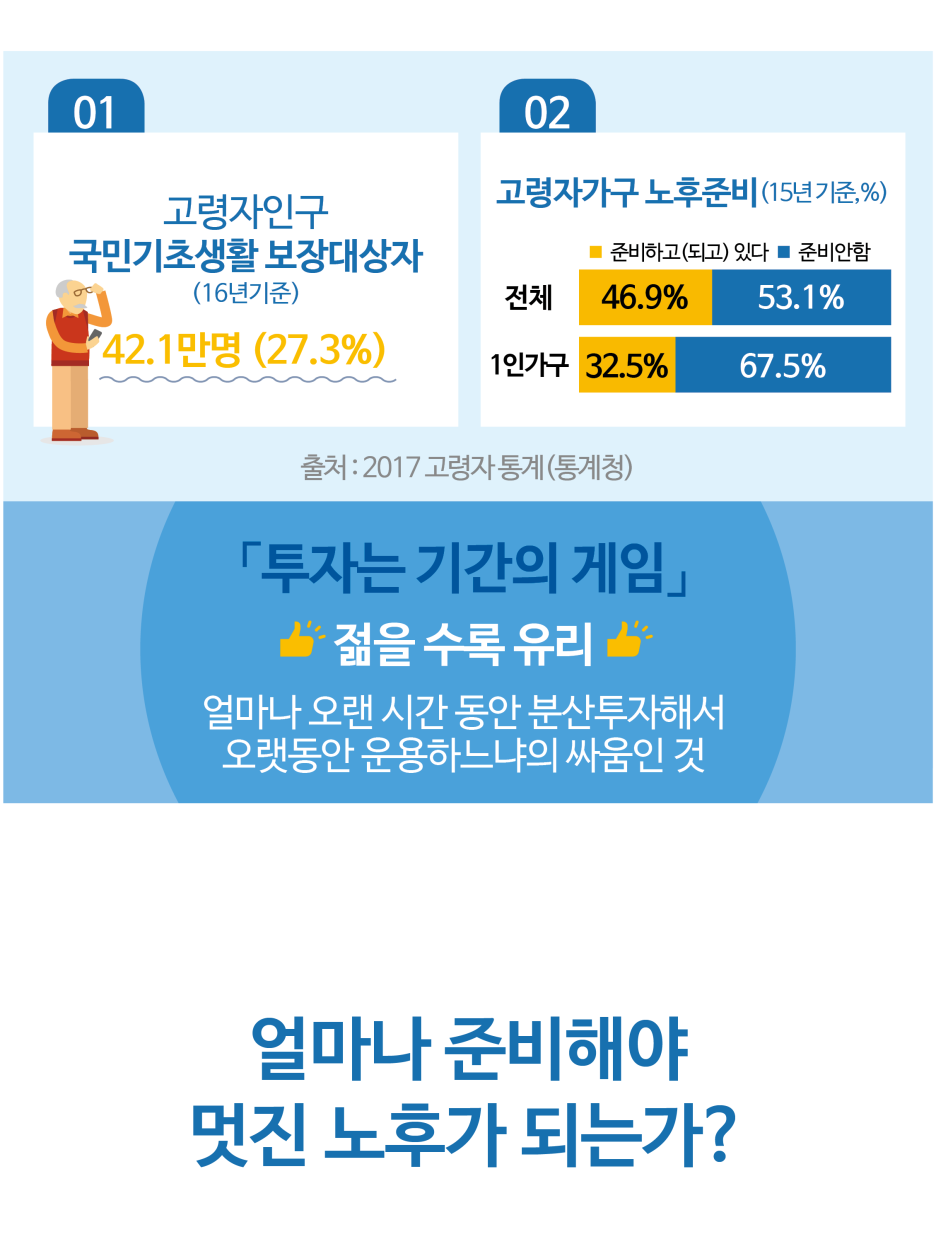 2015년 기준 65세의 기대수명은 남자 18.2년, 여자 22.4년 더 사는 것으로 기대하고 있다. 늘어나는 노후준비는 빠른 시작이 답이다.