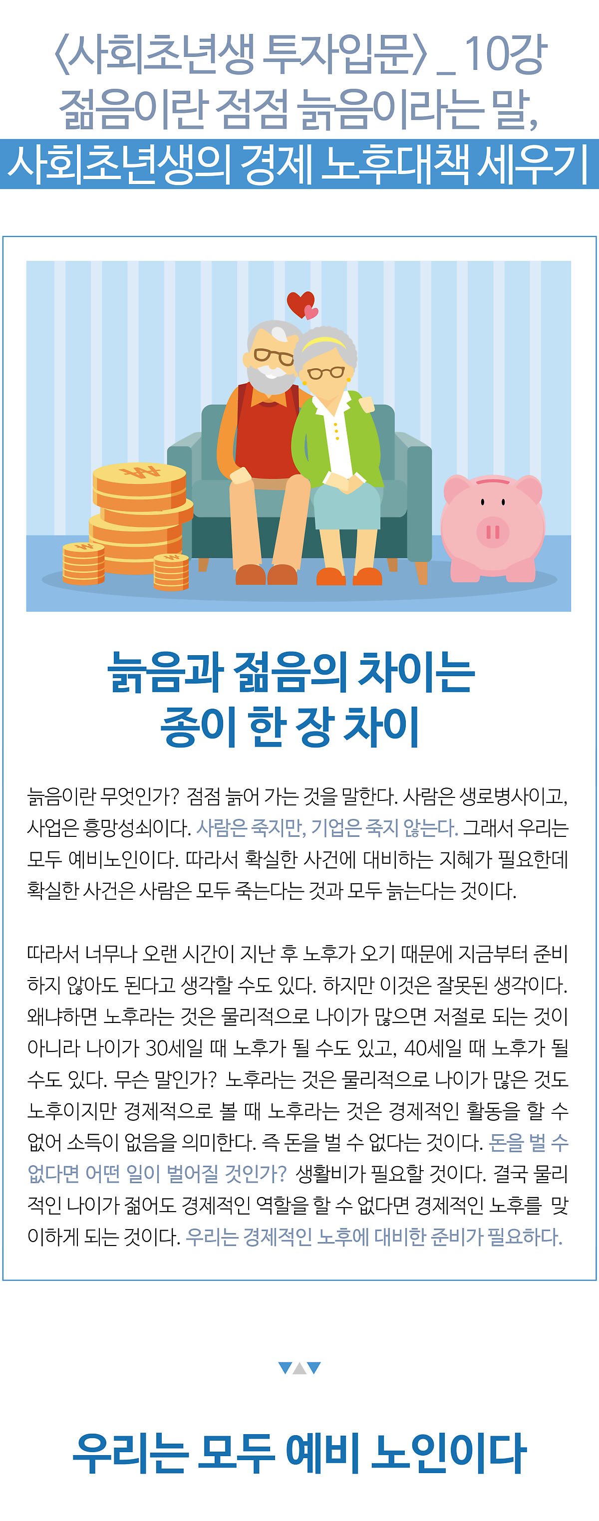 2017년 국민 기초 생활 보장 전체 수급자 154만명 중 고령자(65세 이상)는 42만 천명(27.3%) 이었다. 즉 노인이 되어 돈을 벌 수 없을 때 먹고 살 생활비가 없다면 경제적인 파산이 되는 것이다. 일본에서는 이를 두고 노후 파산이라는 말을 한다. 따라서 노인이 되어 경제적인 활동을 할 수 없는데 생활비가 없는 상황이 가장 최악의 상황이다. 이러한 상황에 대해서 어느 누구도 책임지지 않는다. 각자도생이란 말이 있다. 가난은 나라님도 해결할 수 없다고 한다. 스스로 준비해야 하는 것이다. 김훈 작가는 「칼의 노래」에서 ‘다가올 한 끼니는 지나간 수천 끼니를 능가한다’라고 했다. 그만큼 먹고사는 것이 중요하는 뜻이다.