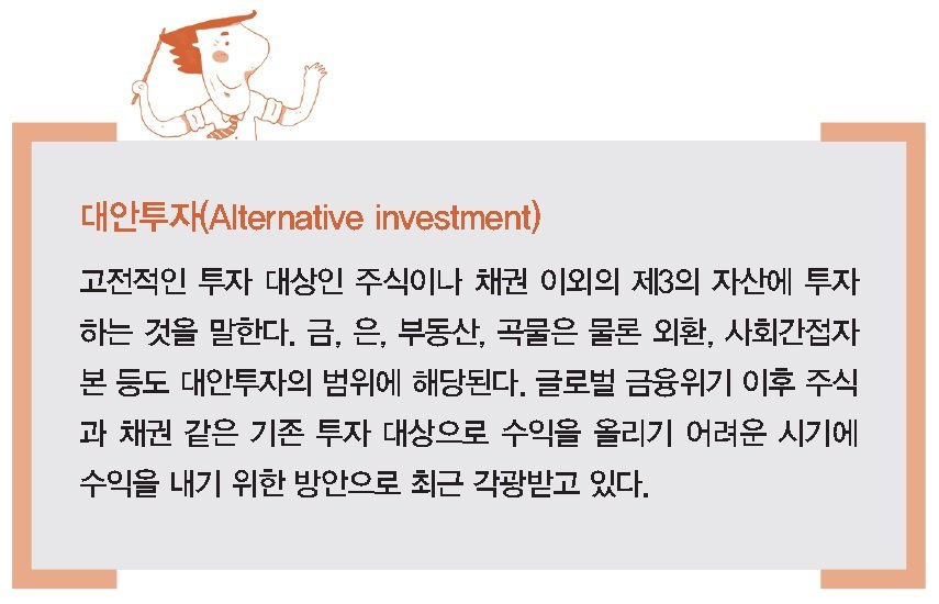 인컴형 자산은 대안투자(Alternative Investment)에서찾아볼 수 있다. 임대수입이 매달 꾸준히 발생하는 상업용 부동산은 시장 상황 변화에도 자산 본연의 가치를 지킬 가능성이 높다. 그리고 특별한 상황이 아니면 큰 시세 하락이 일어나지 않는다. 이 밖에도 사회간접자본 투자도 안정적으로 배당을 받기 좋다. 우리나라도 민자 고속도로나 지하철 등에 투자한 펀드들이 안정적인 수입을 내고 있다. 다만 인컴형 자산에 투자하더라도 다른 모든 투자와 마찬가지로 장기로 분산투자할 필요가 있다는 것은 명심해야 한다.