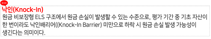 일반적인 ELS도 기초자산의 종류, 기초자산의 개수, 낙인(knock-in)*수준, 만기구조, 중도상환조건 등에 따라 워낙 다양한 ELS들이 있다고 한다.