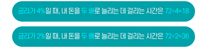 금리가 4%일 때는 18년, 금리가 2%일 때는 36년이 걸립니다.
