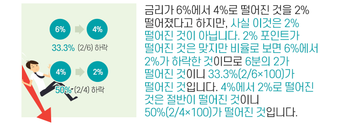6%에서 4% 떨어질 때와 4%에서 2%로 떨어진 경우는 똑같이 2%씩 떨어진 것인데 내 돈을 두 배로 늘리는 데 걸리는 시간의 차이가 크게 나는 이유는 무엇일까요?