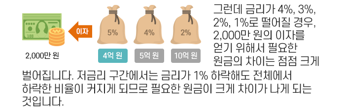 금리가 5%일 때 1년에 2,000만 원의 이자를 받으려면 원금은 4억 원(2,000만 원÷5%=4억)이 있어야 합니다.