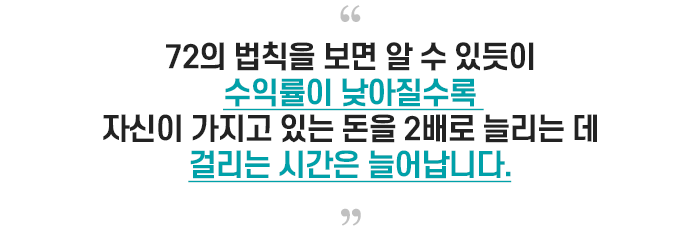 72의 법칙은 앞서 살펴본 것과 같이 시간과 수익률의 관계를 따져 볼 수 있는 간단한 공식으로, 자신이 필요한 자금을 모으기 위해 얼마만큼 수익률을 내야 하는지, 혹은 필요한 자금을 모으기 위해 시간이 얼마나 필요한지 쉽게 파악할 수 있게 합니다.