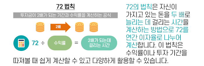 투자를 시작할 때 72의 법칙을 유념한다면 체계적으로 자산을 배분하고 투자를 성공으로 이끌 수 있을 것입니다.