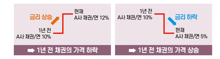 이 채권의 조건은 10년 만기, 연 10% 금리입니다. 1년이 지났는데, 똑같은 회사가 연 12%의 금리로 채권을 발행합니다. 현재 A 회사의 채권은 연 12%의 이자를 얻을 수 있는데, 1년 전 채권을 가지고 있는 사람은 연 10%밖에 이자를 얻지 못합니다. 따라서 기존에 가지고 있던 채권은 인기가 떨어지고, 그만큼 가격도 떨어지게 됩니다.