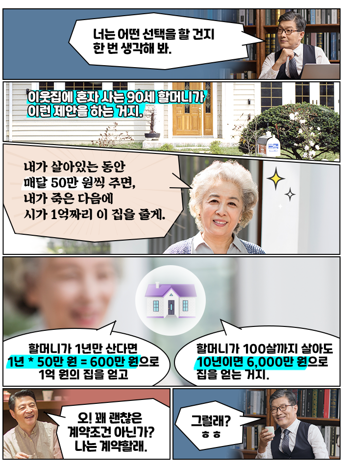 두 사람 모두 계약에 만족스러웠습니다. 별다른 소득이 없던 할머니 입장에서는 살아있는 동안 생활비 걱정할 일이 없어졌고, 변호사는 큰 목돈 들이지 않고 싼값에 집주인이 될 수 있으리라 기대했기 때문입니다. 아마도 변호사는 할머니가 아주 오래 사시진 못할 거란 계산을 했겠죠.