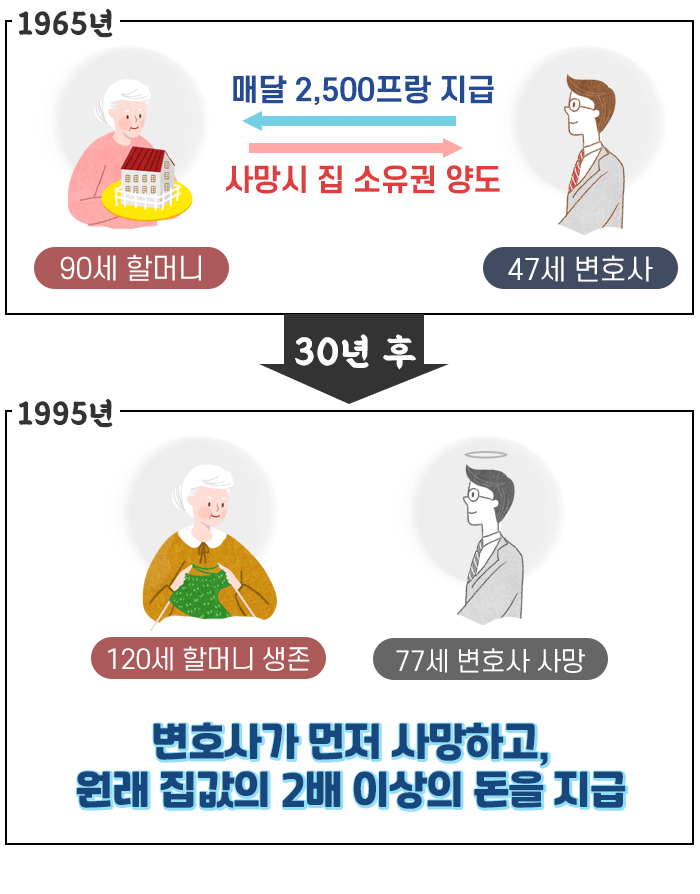 변호사는 잔 칼망 할머니가 살아 있는 동안 매달 2,500프랑(한화 약 50만 원)을 지불하기로 하고, 할머니가 돌아가시면 집에 대한 소유권을 넘겨받기로 했습니다. 이때 변호사의 나이는 47세로 할머니와 마흔세 살이나 차이가 났습니다.