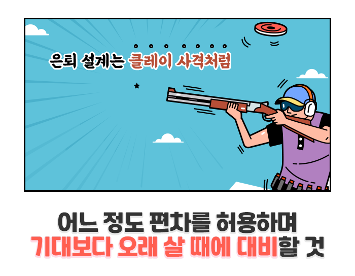 클레이 사격에서 움직이는 타깃을 맞추려면 목표물을 정조준해선 안 되고, 목표물의 진행 방향을 예측해 앞쪽을 조준해야 합니다. 은퇴 설계도 마찬가지입니다.