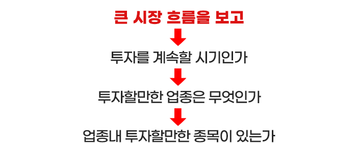 “저는 보통 큰 시장 흐름을 보고 투자를 계속할 시기인지, 그리고 투자할만한 괜찮은 업종은 뭔지, 그리고 그 업종 내에서 투자의 기회가 있을 만한 종목이 있는지 확인해요.