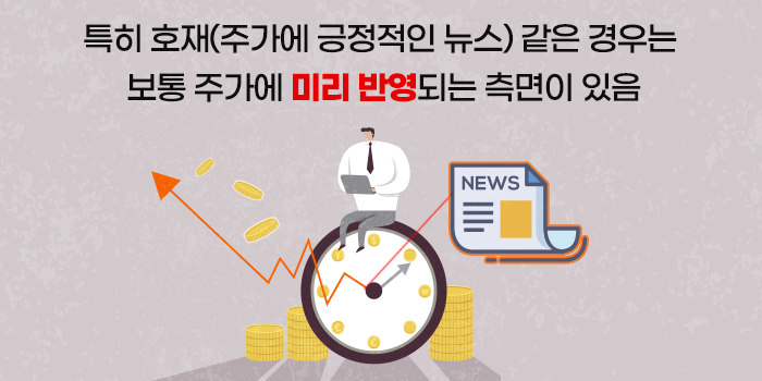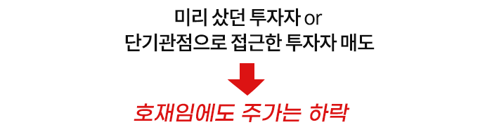 다들 좋은 뉴스가 주가를 이끌 것이라고 기대하니까. 그런데 막상 호재가 나오게 되면 주가는 먼저 이를 반영한 부분이 있기 때문에 먼저 샀던 투자자나 단기 관점으로 접근하는 투자자가 바로 매도해서 수익을 확정시키려는 경향이 있어요.