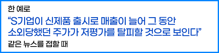 “그럼 ‘소문에 사서 뉴스에 팔아라’ 하는 말이 정답인가요? 전 그렇게 빠르게 대응하고 싶지 않아서 A 기업 내용과 기업가치 대비 저평가인지도 꼼꼼히 봤거든요.”