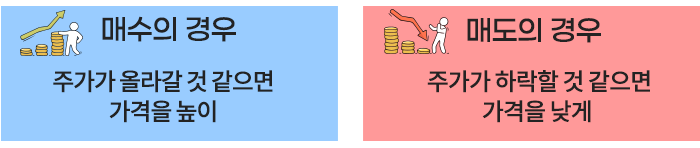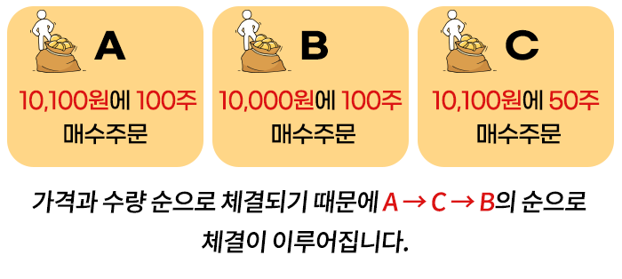 쉽게 얘기하면 매수의 경우에는 가격을 높게, 매도의 경우에는 가격을 낮게 주문한 순서와 많은 수량의 주문을 반영해 가격과 체결이 이루어집니다.