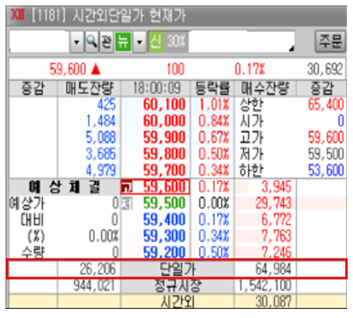 위의 시간외 단일가 매매의 예를 보면 정규시장과 비슷하게 호가에 맞춰 주문을 넣을 수 있다는 것을 확인할 수가 있습니다.