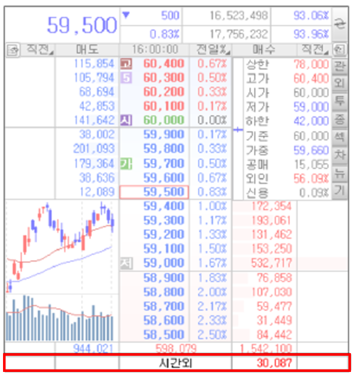 위와 같이 시간외 거래에서 매수 잔량만 3만 주 넘게 남아있는 경우, 매수 주문을 넣어도 거래가 힘듭니다.