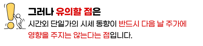 유럽이나 미국 시장이 불안한 흐름을 보인다면 시간 외 단일가의 시세가 전반적으로 하락하는 경향이 높죠. 또한, 장 마감 후에 나온 개별 기업의 뉴스나 실적 발표에도 영향을 많이 받게 됩니다.