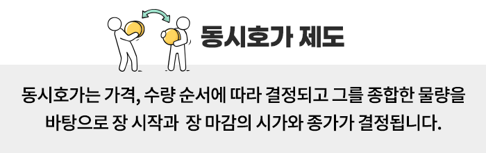 주식시장은 장 시작 전과 마감 전에 주문이 몰리는 경향이 있습니다. 그래서 가격의 안정성과 체결의 공정성을 유지하기 위해 완충지대인 동시호가 제도가 만들어졌습니다.