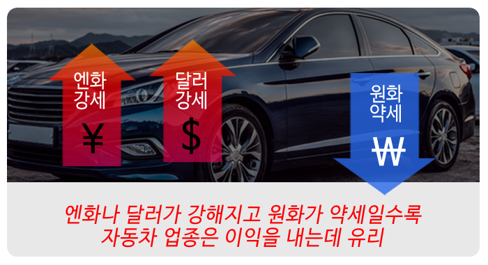원/엔과 원/달러 환율도 자동차업종 수익에 영향을 미친다. 국내 자동차가 일본과 경쟁 관계에 있기 때문에 엔화가 강해질수록 우리 자동차가 유리해진다. 100엔당 1,100원일 때가 1,000원일 때보다 가격을 깎아줄 여지가 크다.