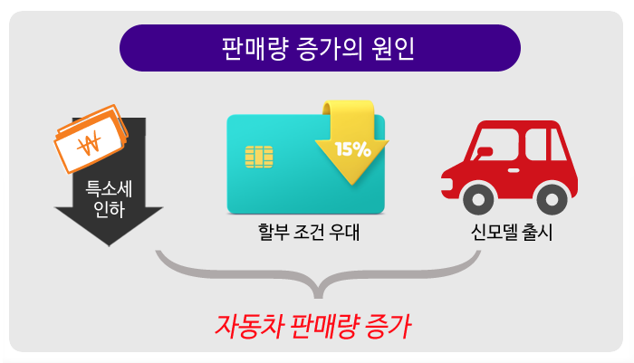 마지막은 정부 정책과 판매 방식이다. 경기가 좋지 않을 때 자동차에 붙는 특소세를 인하해 주는 경우가 있다. 세금을 깎아주면 그만큼 자동차 가격이 낮아져 판매가 늘어나기 때문이다. 할부 조건 등 다양한 판매 방식에 따라, 신모델 출시 등 차종의 변화에 따라서도 판매량이 변한다.