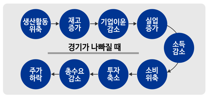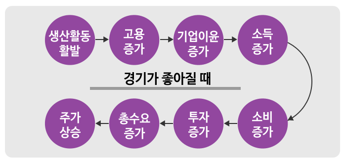 경기가 좋을 때 주가가 상승하고, 경기가 나쁘면 주가도 하락한다. 호경기 때는 평소 매출 부진에 허덕이던 기업조차 설비를 증설해야 할 정도로 매출이 늘어나 이익이 크게 증가한다. 반대로 불경기 때에는 수요가 줄어 대표 기업조차 적자를 기록할 정도가 된다.