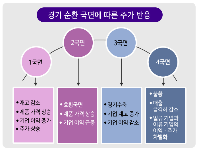 4국면 : 불황으로 매출이 줄어드는 등 극도로 위축되는 시기다. 이익이 크게 줄고 업종 내 일류 기업과 이류 기업 사이에 이익과 주가의 차별화가 나타난다. 주가는 3국면에서 불황을 먼저 반영한 영향으로 하락률이 3국면보다 작다.