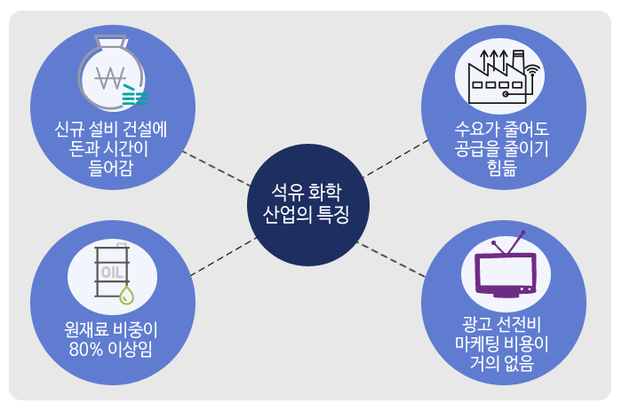 석유화학 업종은 신규 설비 건설에 많은 돈과 시간이 들고 공장을 24시간 돌려야 하기 때문에 수요가 줄어도 공급을 줄이기 힘들다.