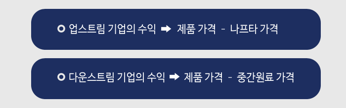 업스트림 기업은 원재료인 나프타 가격과 이를 이용해 만든 제품 가격 사이의 차이, 다운스트림 기업은 중간원료와 제품 가격 사이의 차이(=가격 스프레드)에 의해 수익이 결정된다.