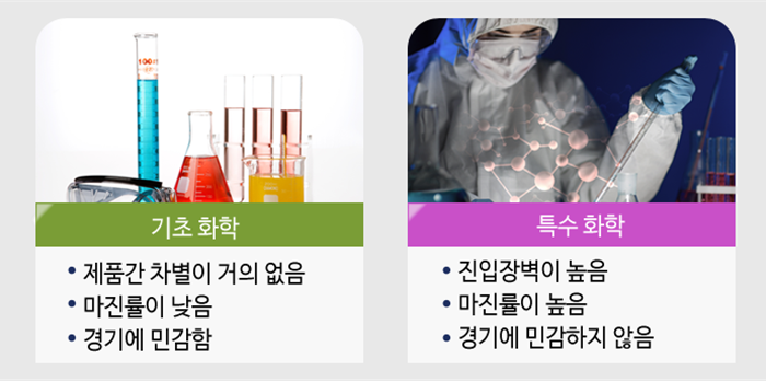 특수 화학제품은 기능성 원료 등 특정 목적에 사용된다. 특수한 곳에 사용되므로 기초 화학제품보다 적은 양을 만든다. 특수 화학제품은 접착제 및 촉매, 코팅, 플라스틱 첨가제 등에 쓰인다. 전체 사용량이 많지 않지만, 제품의 생산과 성능에 필수적이어서 경기가 나빠도 기초 화학제품처럼 수요가 급격히 줄어들지 않는다. 특수 화학제품은 다른 생산자가 쉽게 복제할 수 없거나 특허를 통해 보호받기 때문에 진입장벽이 높아 기초 화학제품보다 훨씬 높은 이익 마진을 가지고 있다.