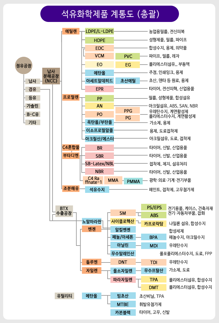 제품 이름도 생소하고 흔하지 않아 피부에 와닿지 않겠지만 화학이 유일하게 연결을 통해 제품이 만들어지기 때문에 계통도를 조금이라도 이해할 필요는 있다.