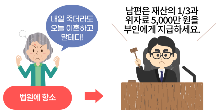 이에 할머니는 “평생 억눌려 살아온 여성 노인들이 여생이나마 남편의 굴레에서 벗어나 인간답게 살아보겠다는 소망을 거부하는 판결은 여성 노인들의 인간 존엄성과 행복추구권을 박탈하는 처사”라며 “내일 죽더라도 오늘 이혼하고 싶다”고 대법원에 항소했습니다. 결국 할머니는 남편으로부터 재산의 1/3과 위자료 5,000만 원을 지급받으라는 판결을 받아냈습니다.