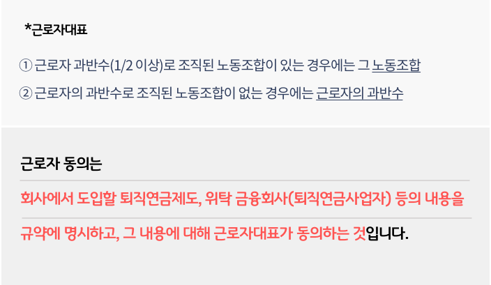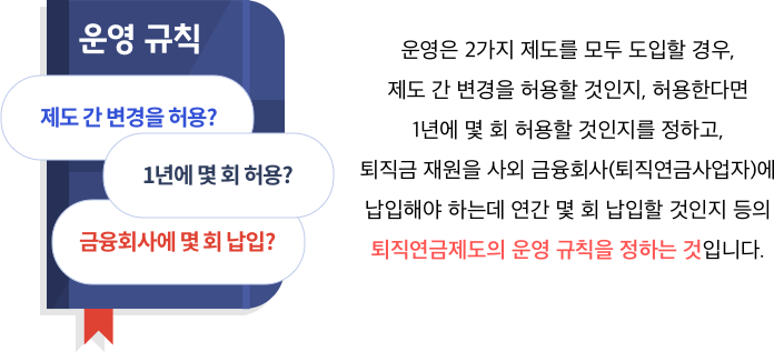 회사는 퇴직연금제도 유형과 퇴직연금 운영 방법, 절차 등에 대해 정해야 합니다.