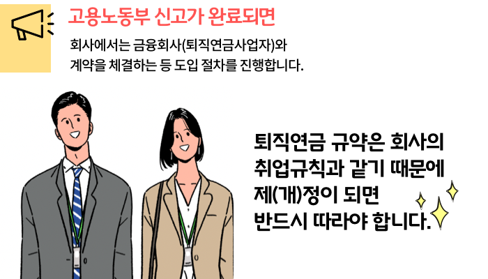 만약, DB, DC 제도 모두를 도입하기로 했다면, 각각의 제도별 규약을 작성해야 하는데, 규약은 기존의 퇴직금 규정과 같은 개념으로 취업규칙의 일부라고 생각하면 됩니다.