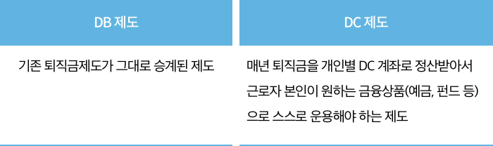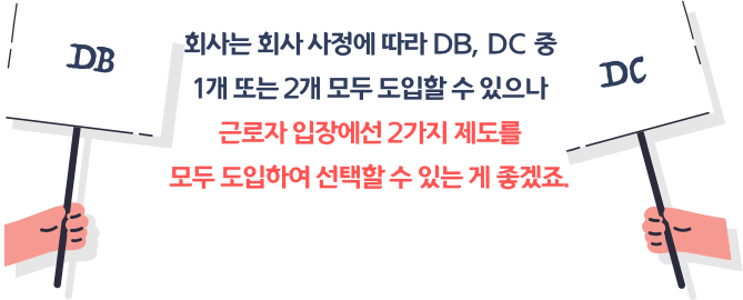 퇴직연금제도에는 확정 급여형(DB : Defined Benefit)과 확정 기여형(DC : Defined Contribution)이 있습니다.