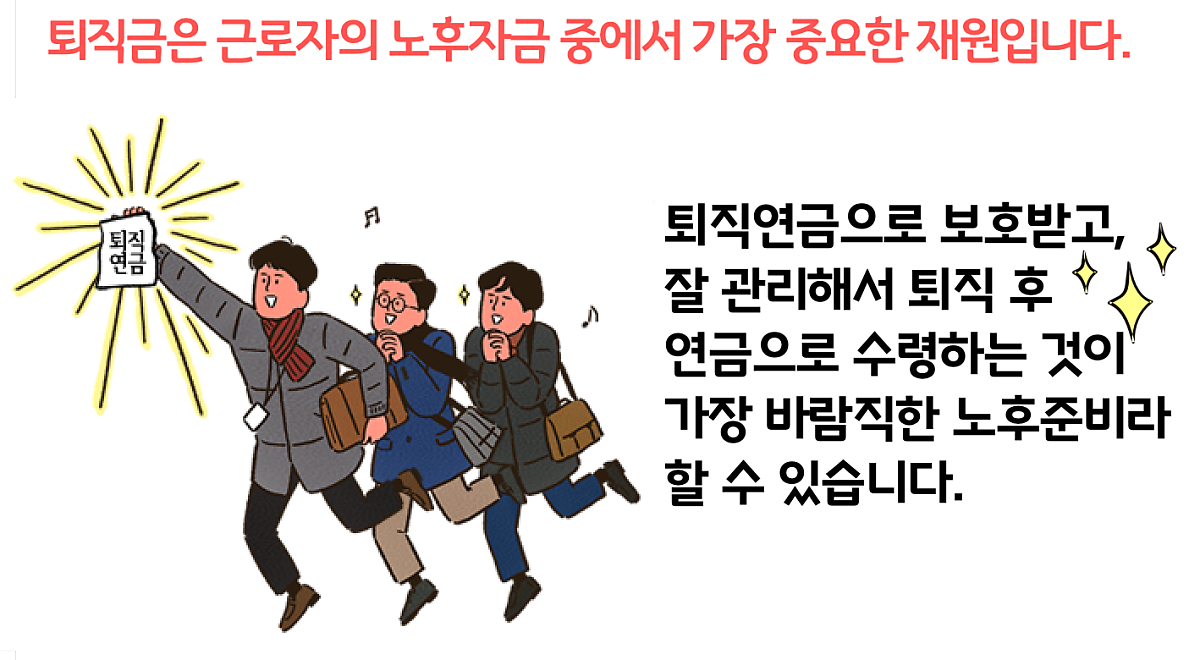 하지만, 퇴직연금은 기존처럼 퇴직금을 일시금으로 수령할 수도 있고, 본인이 원하는 기간 동안 연금으로 나눠서 수령할 수도 있습니다.