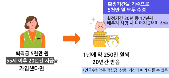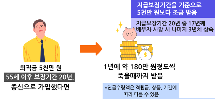예컨대 현금 5,000만 원으로 지급보장 기간이 20년인 종신보험을 선택한 가입자가 연금수령 중 17년 차에 사망한다면, 나머지 3년간의 연금은 상속인에게 상속됩니다.